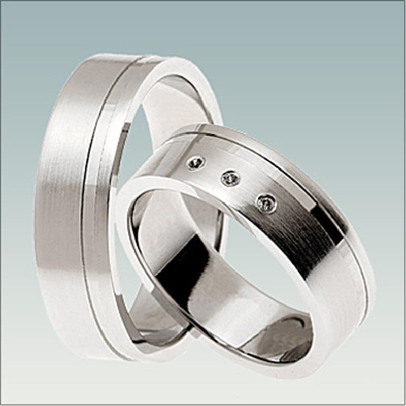 Poročna prstana model BN 147 sta široka 6 mm. Ženski prstan vsebuje tri diamante, ki so že všteti v ceno. Prstana lahko izdelamo v belem, rumenem ali rdečem zlatu.