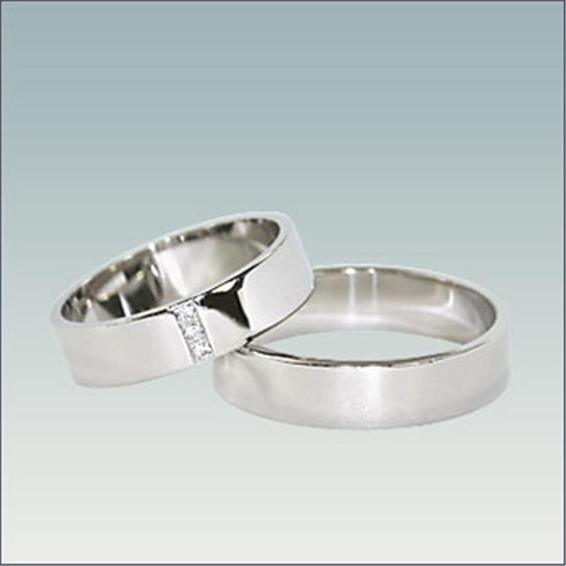 Poročna prstana model M 490 sta široka 5 mm. Ženski prstan vsebuje tri diamante, ki so že všteti v ceno. Prstana lahko izdelamo v belem, rumenem ali rdečem zlatu.