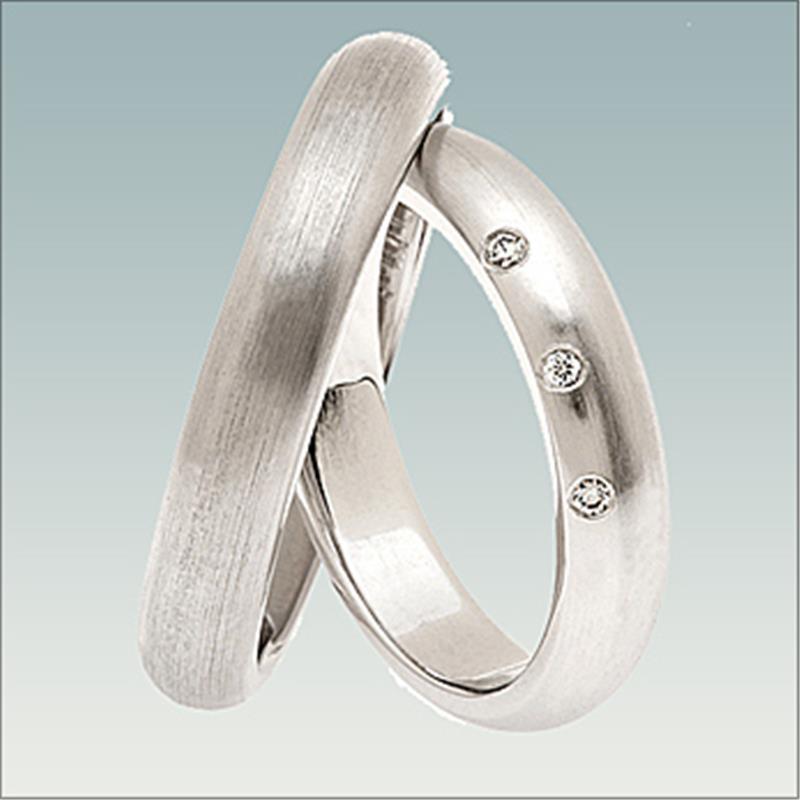 Poročna prstana model MN 254 sta široka 4 mm. Ženski prstan vsebuje tri diamante, ki so že všteti v ceno. Prstana lahko izdelamo v belem, rumenem ali rdečem zlatu.