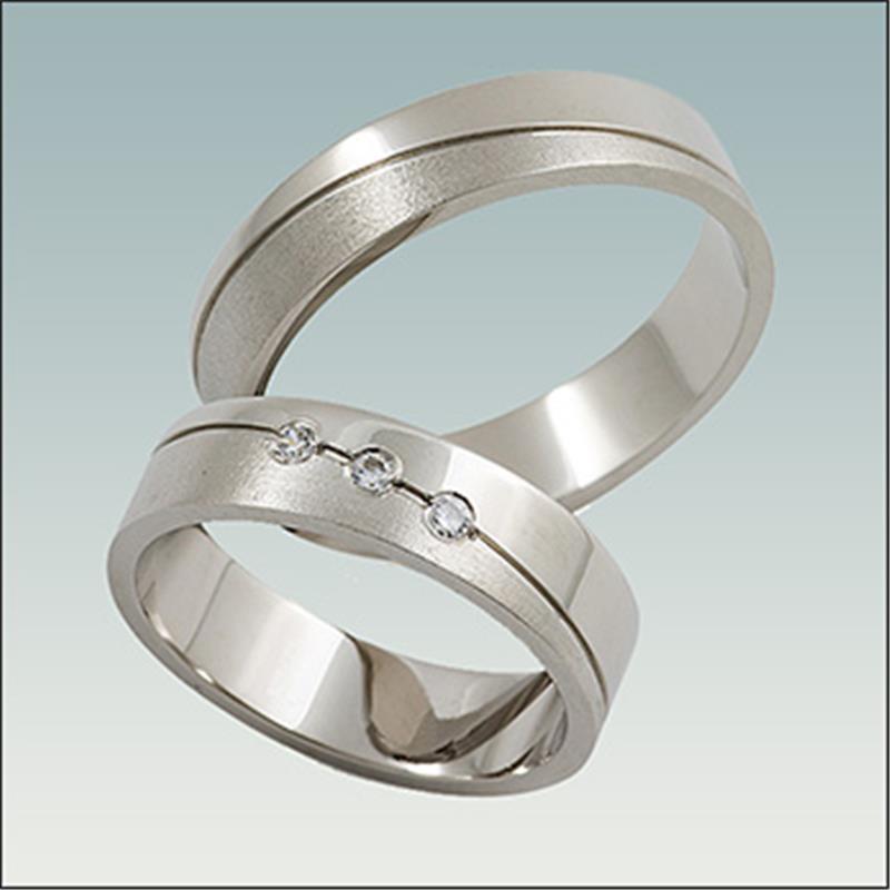 Poročna prstana model PB 11 sta široka 5 mm. Ženski prstan vsebuje tri diamante, ki so že všteti v ceno. Prstana lahko izdelamo v belem, rumenem ali rdečem zlatu.