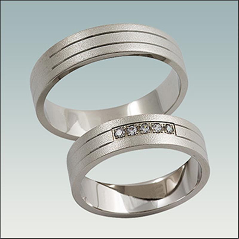 Poročna prstana model PB 16 sta široka 5 mm. Ženski prstan vsebuje pet diamantov, ki so že všteti v ceno. Prstana lahko izdelamo v belem, rumenem ali rdečem zlatu.