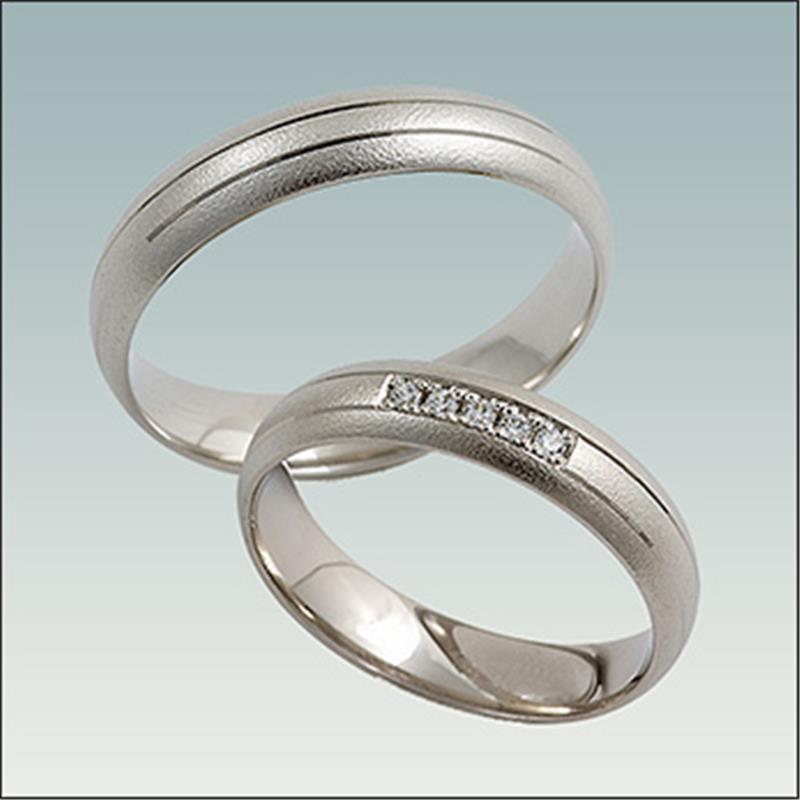 Poročna prstana model PB 17 sta široka 4 mm. Ženski prstan vsebuje pet diamantov, ki so že všteti v ceno. Prstana lahko izdelamo v belem, rumenem ali rdečem zlatu.