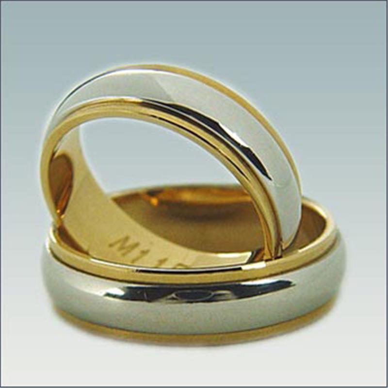 Poročna prstana model M 115 sta široka 6 mm. Lahko ju izdelamo v belo-rumeni ali belo-rdeči kombinaciji zlata.