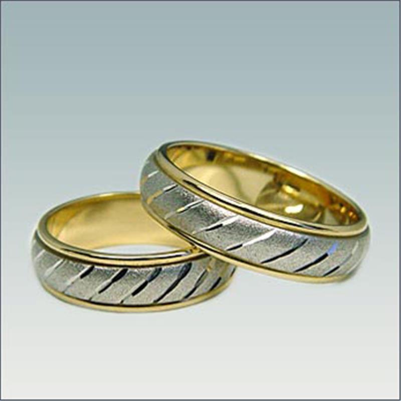 Poročna prstana model M 338 sta široka 6 mm. Lahko ju izdelamo v belo-rumeni ali belo-rdeči kombinaciji zlata.