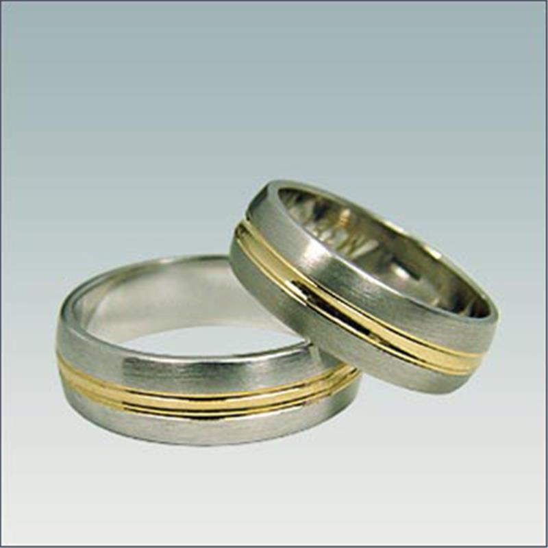 Poročna prstana model M 387 sta široka 6 mm. Lahko ju izdelamo v belo-rumeni ali belo-rdeči kombinaciji zlata.