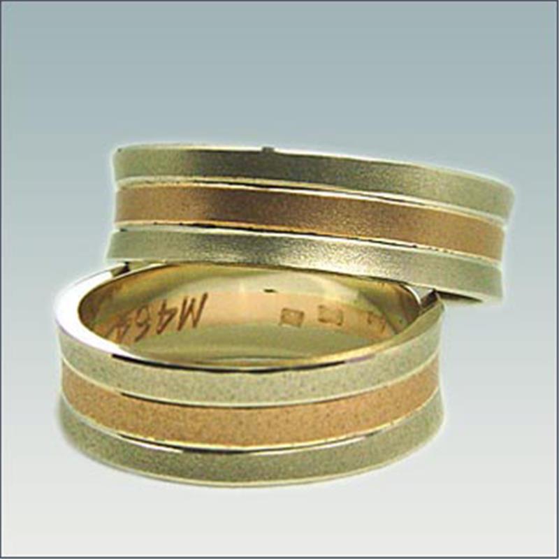 Poročna prstana model M 464 sta široka 6 mm. Lahko ju izdelamo v belo-rumeno-beli ali belo-rdeče-beli kombinaciji zlata.