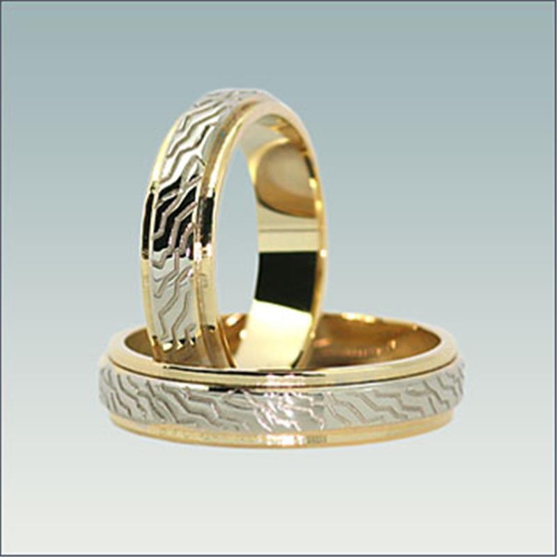 Poročna prstana model M 842 sta široka 5 mm. Lahko ju izdelamo v belo-rdeči , belo-rumeni ali rumeno-rdeči kombinaciji zlata.