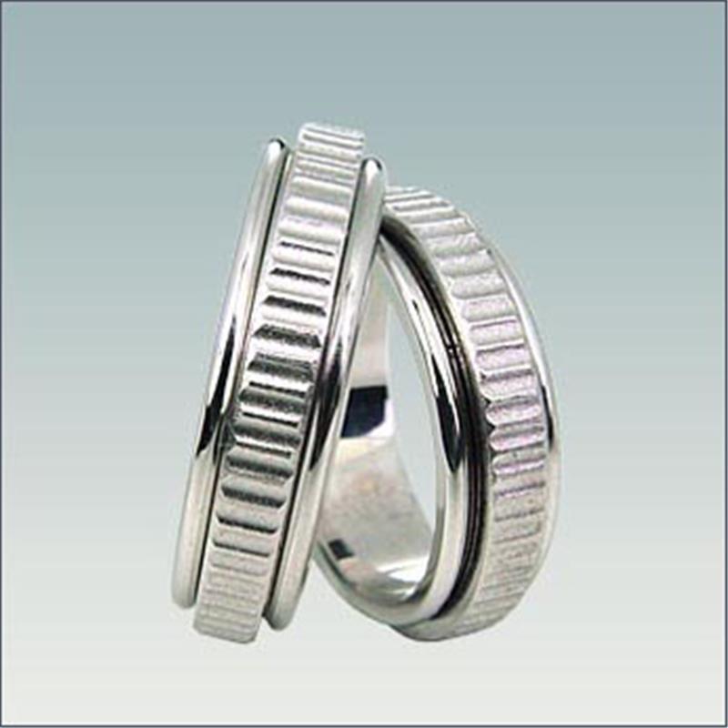 Poročna prstana model M 439 sta široka 6 mm. Srednji del prstana je vrtljiv. Prstana lahko izdelamo v belem, rumenem ali rdečem zlatu.