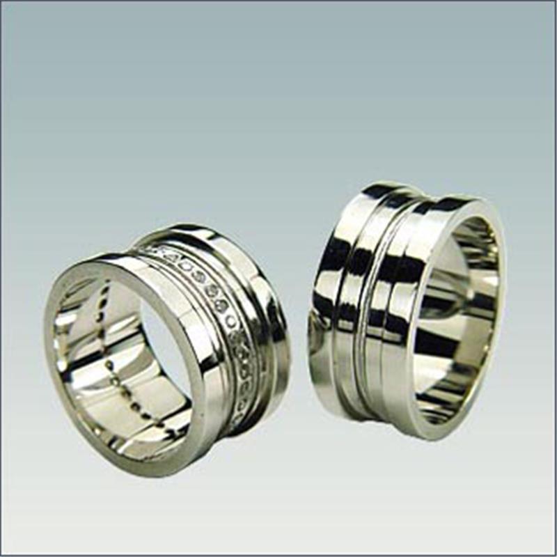 Poročna prstana model M 601 sta široka moški 10 mm, ženski 12 mm. Ženski prstan vsebuje 31 diamantov, ki so že všteti v ceno. Prstana lahko izdelamo v belem, rumenem ali rdečem zlatu.