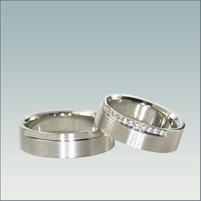 Poročna prstana model M 614 sta široka 6 mm. Ženski prstan vsebuje 19 diamantov, ki so že všteti v ceno. Prstana lahko izdelamo v belem, rumenem ali rdečem zlatu.