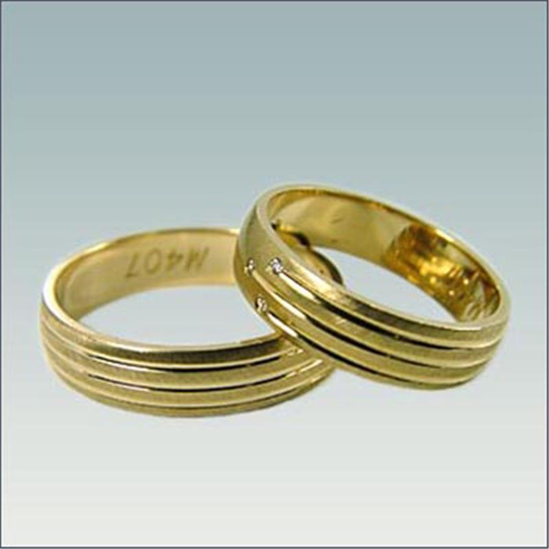 Poročna prstana model M 407 sta široka 5 mm. Ženski prstan vsebuje tri diamante, ki so že všteti v ceno. Prstana lahko izdelamo v rumenem, belem ali rdečem zlatu.